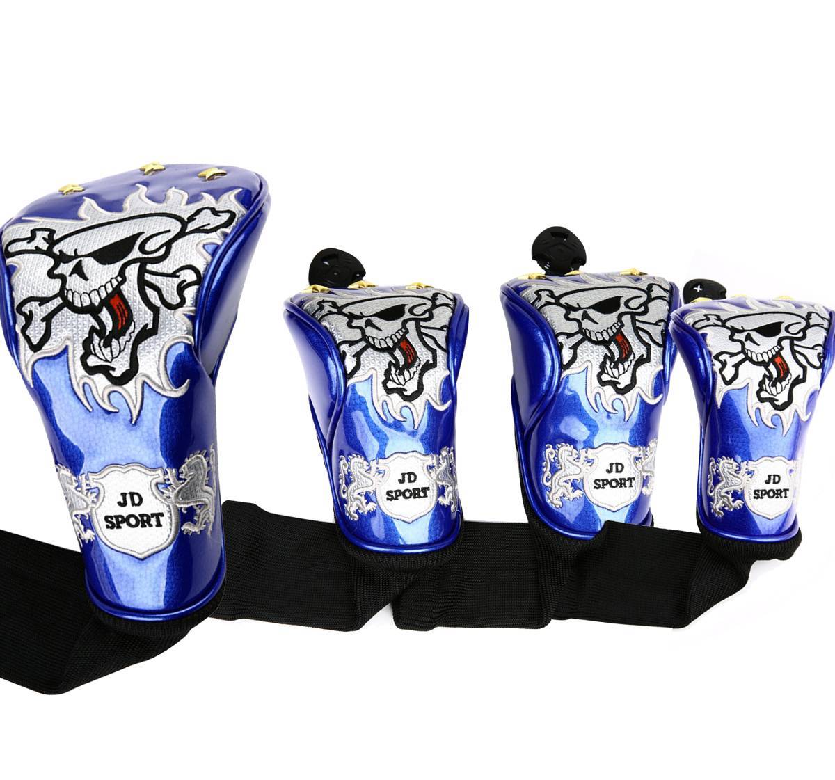 > 高級pu革 ドライバー/ウッド/ユーティリティ UT用 FW ヘッドカバー 4点セット スカル模様 防水仕様 変換ダグ付き 青