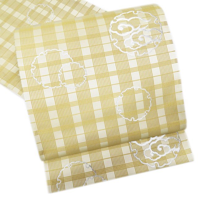- 袋帯 中古 リサイクル 正絹 カジュアル 仕立て上がり 六通 格子模様 雪輪 瑞雲 薄香色 枯色 銀 きもの北條 A942-10