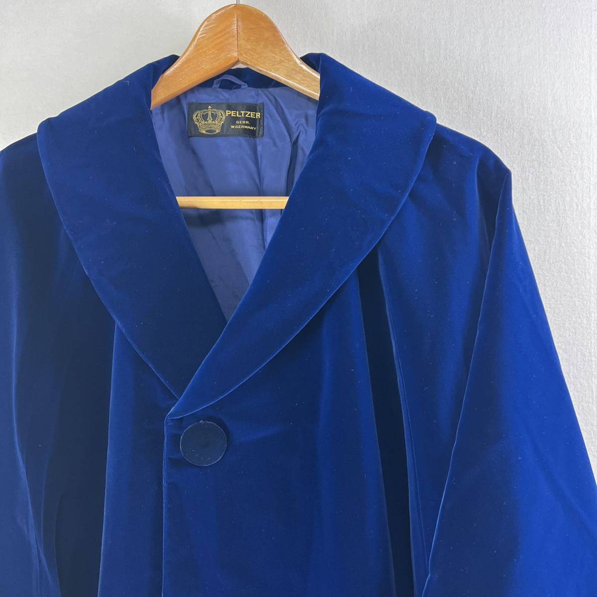 > ビンテージ 70s【PELTZER】ブルーベルベット West Germany製 羽織り 着物 古着 ショールカラー ベロア 西ドイツ コート ジャケット 和柄