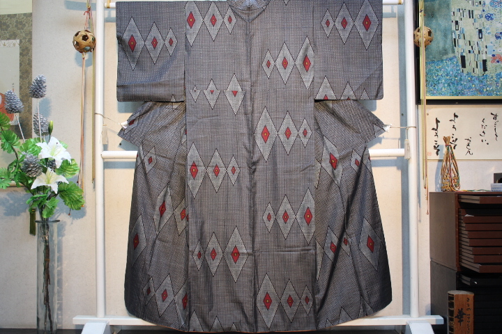 > きもの今昔6029 本場村山大島紬 広衿袷手縫い仕立て 小丸のデザインバックに紺色大小菱柄に赤色芯 美品 身丈あ156