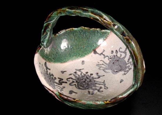 - 本物保証 北大路魯山人 蟹絵織部 手提鉢 19.5cm 共箱 3ヶ月以内 本物返品OK 176