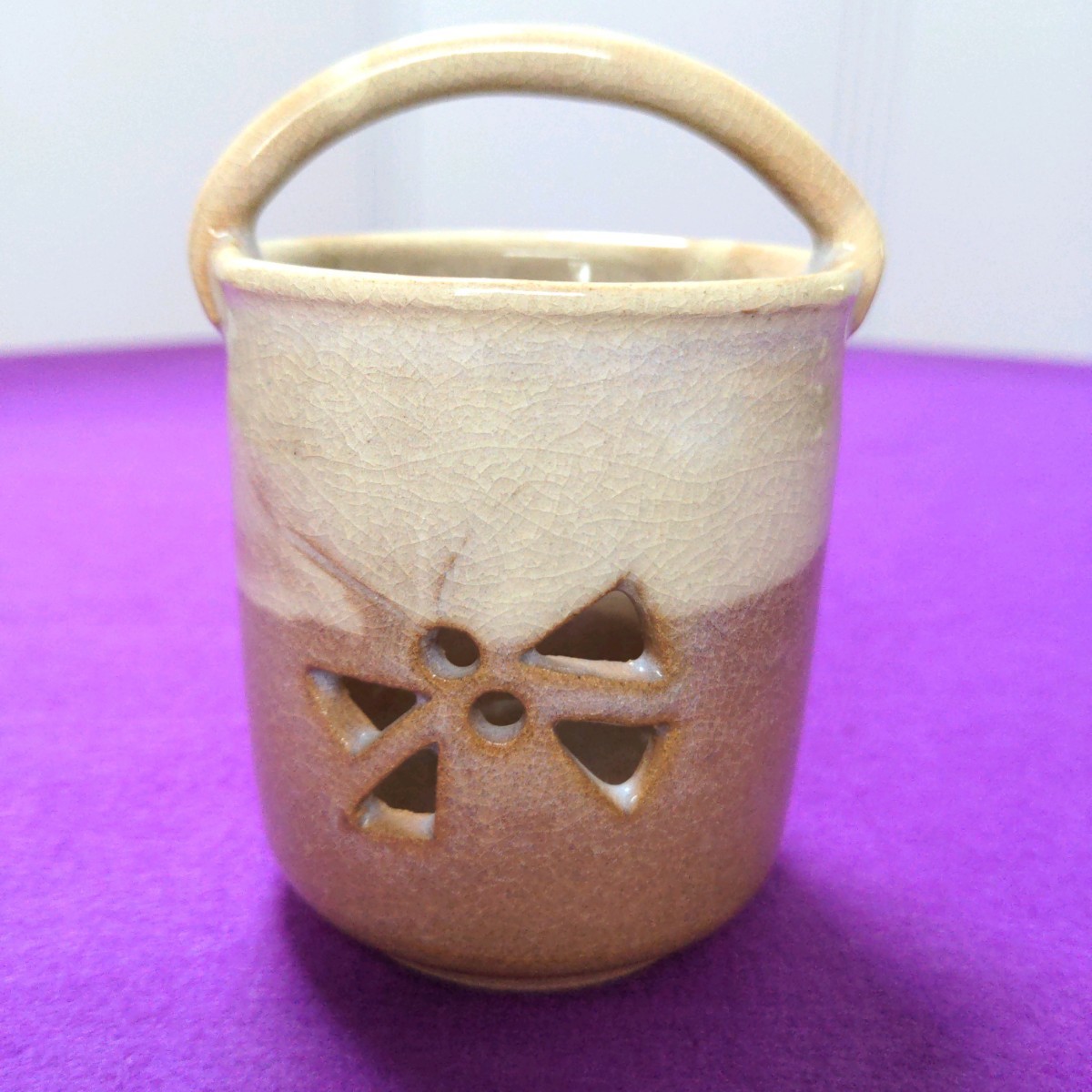 - 香炉? 焼物 陶器 容器 入れ物 持ち手付き 蝶 刻印あり 全長約11cm 口径約7.3cm 持ち手を含まない高さ約8.3cm 蝶々 柔らかい色合い