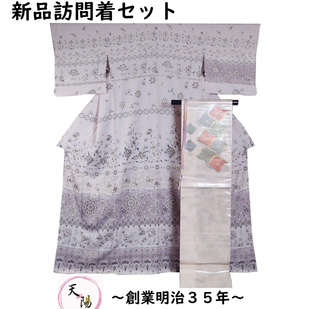 > 着物セット 新品 訪問着・螺鈿 袋帯・帯締め 3点 セット Lサイズ 横段に唐花更紗模様 裄長 トールサイズ 中古 リサイクル着物 正絹 天陽