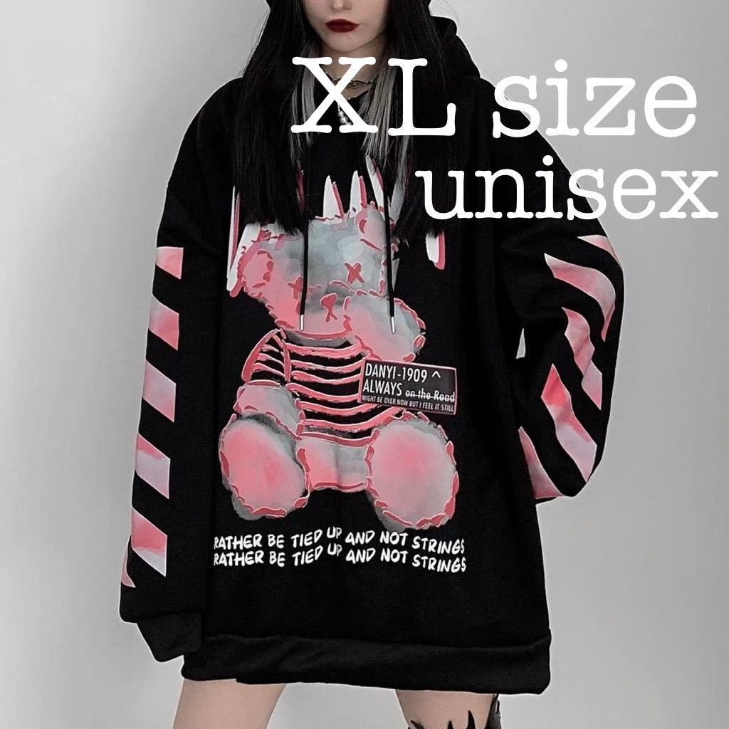 > パーカー ビッグシルエット くま クマ ベア トップス フード 長袖 プリント 大好評 ブラックユニセックス 男女兼用 黒 XL