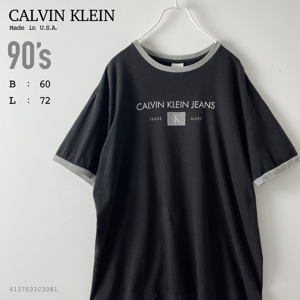 > 90s - 00s Calvin Klein メンズ XL 相当 USA製 ロゴ プリント 半袖 リンガー Tシャツ 黒 ブラック オーバーサイズ ヴィンテージ モノトーン