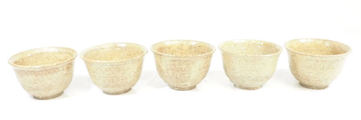 - 昭和ビンテージ ザラ焼 花碗五客揃 在銘品 湯呑 茶器 陶器 箱無し 1980年代 直径8.5cm 高さ5.5cm FEM512