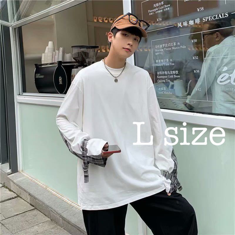 - ロングTシャツ チェック トップス ロンT ビッグシルエット ホワイト 白 L