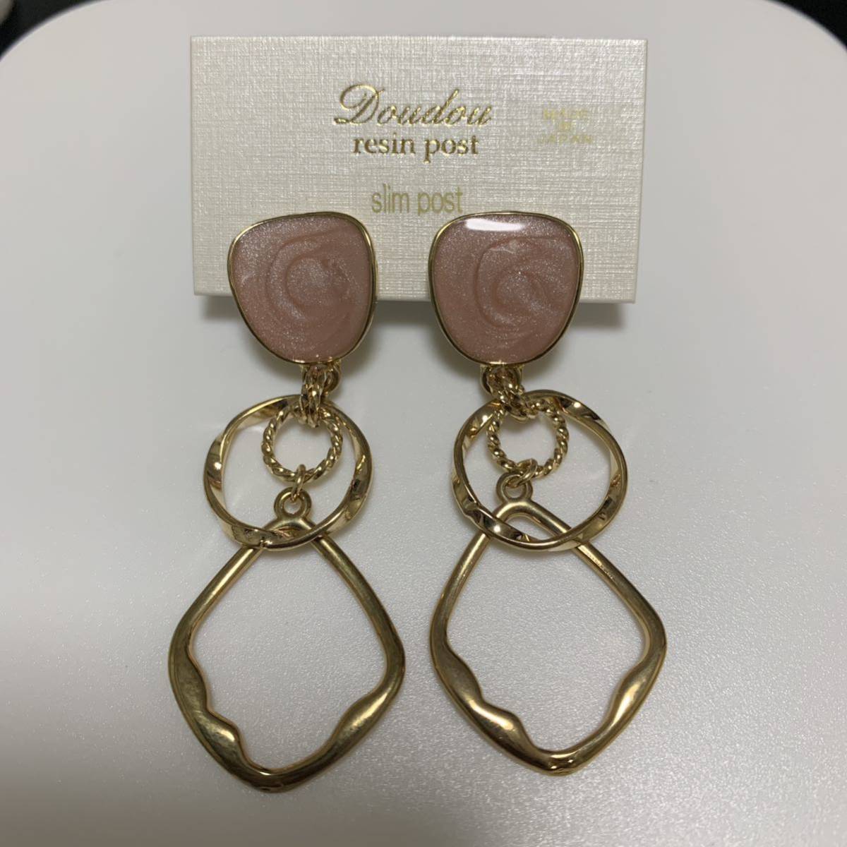 - くすみピンク マーブル カボション フープデザイン 樹脂 ピアス ゴールド