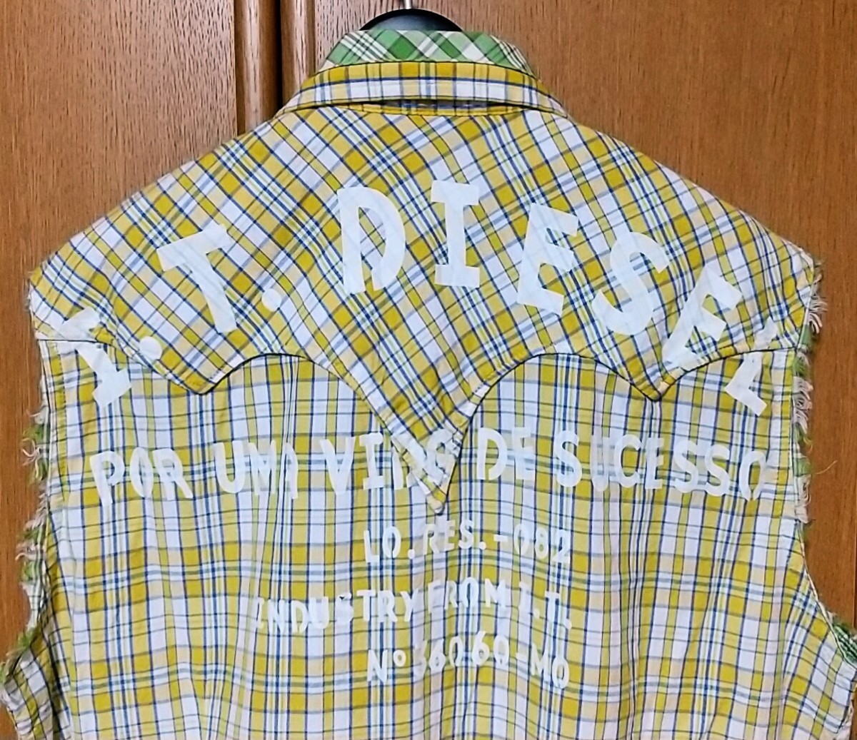> DIESEL ディーゼル ノースリーブ シャツ メンズ カットオフ加工 刺繍 バックプリント ロゴ イエロー チェック ウエスタン