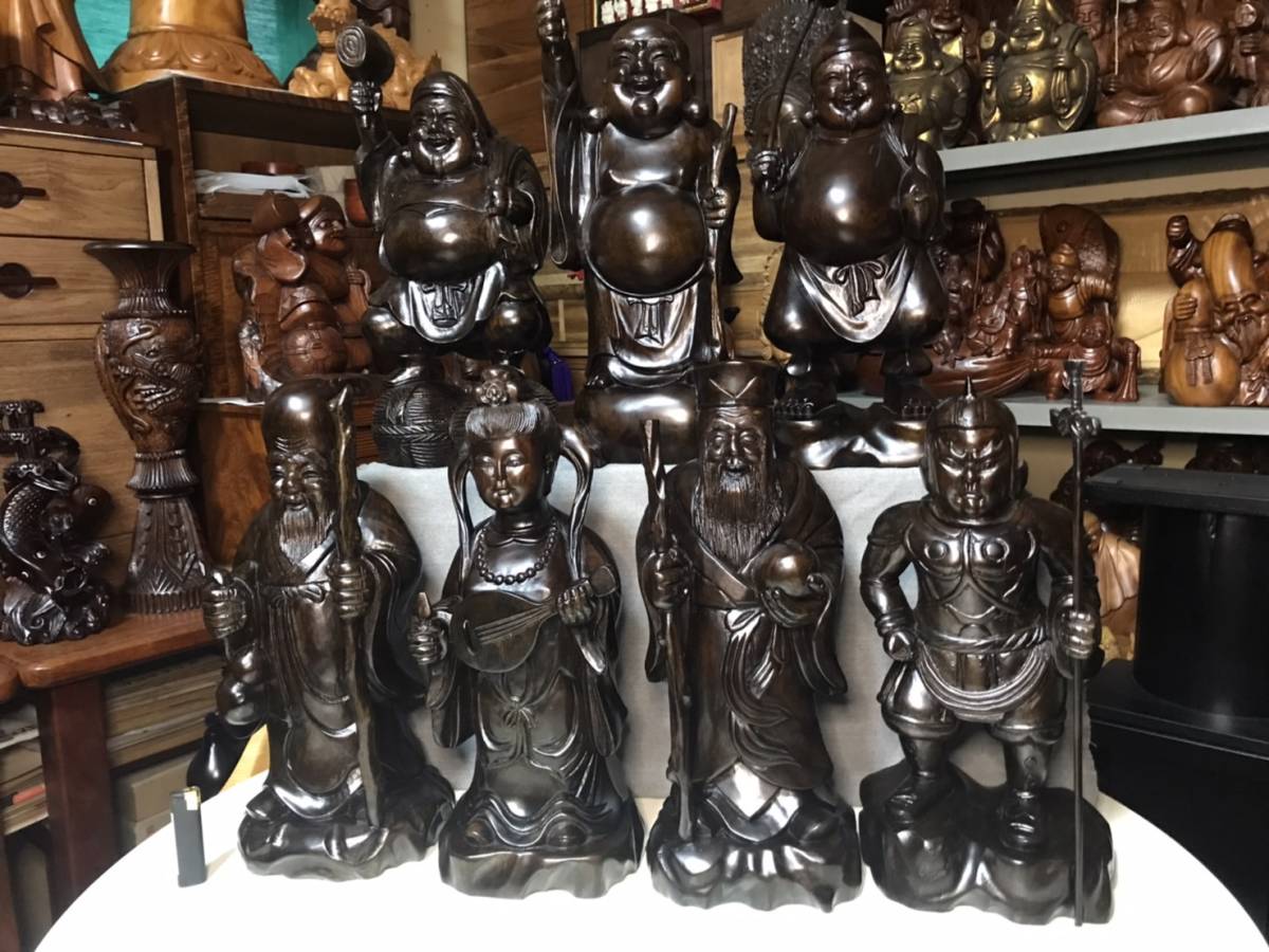 - A2 木彫 彫刻 七福神 七体揃 唐木 無垢 刳り貫き 茶道具 書道具 盆栽具 華道具 工芸品 美術品