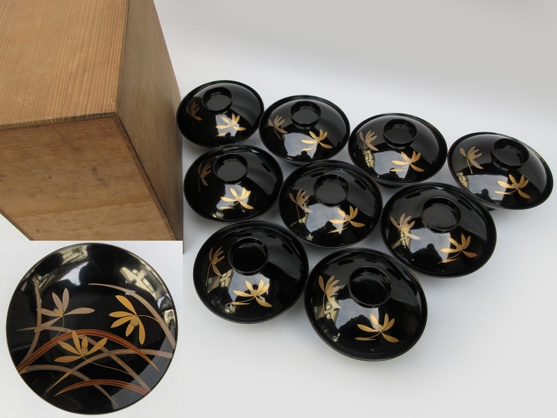 > 椀 ■ 吸物椀 蘭 蒔絵 [径約13.3×h約9cm ] 椀 9客 ■ 天然木 蓋裏蒔絵 茶道具 懐石 料亭 割烹 木箱入り №9373■