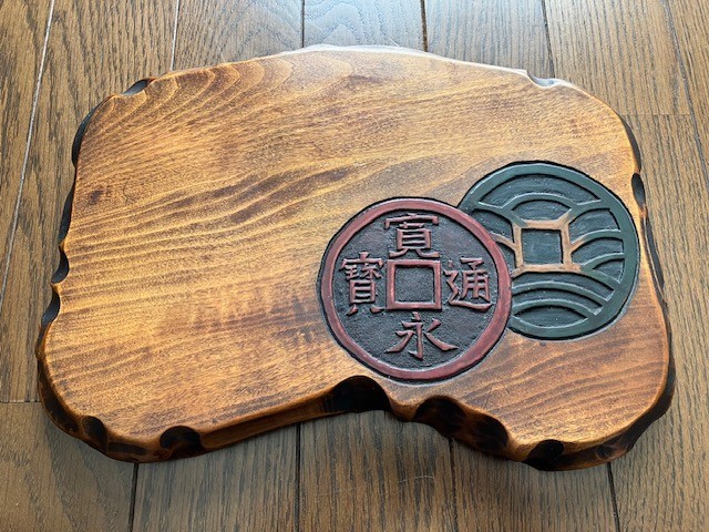 - 天然木 寛永通寳 四文銭 手彫り 横30㎝ 縦22㎝ 高さ2.6㎝ 829g 清綱彫刻刀使用 置き台 児島 久保喜久子 作 送料無料 底値