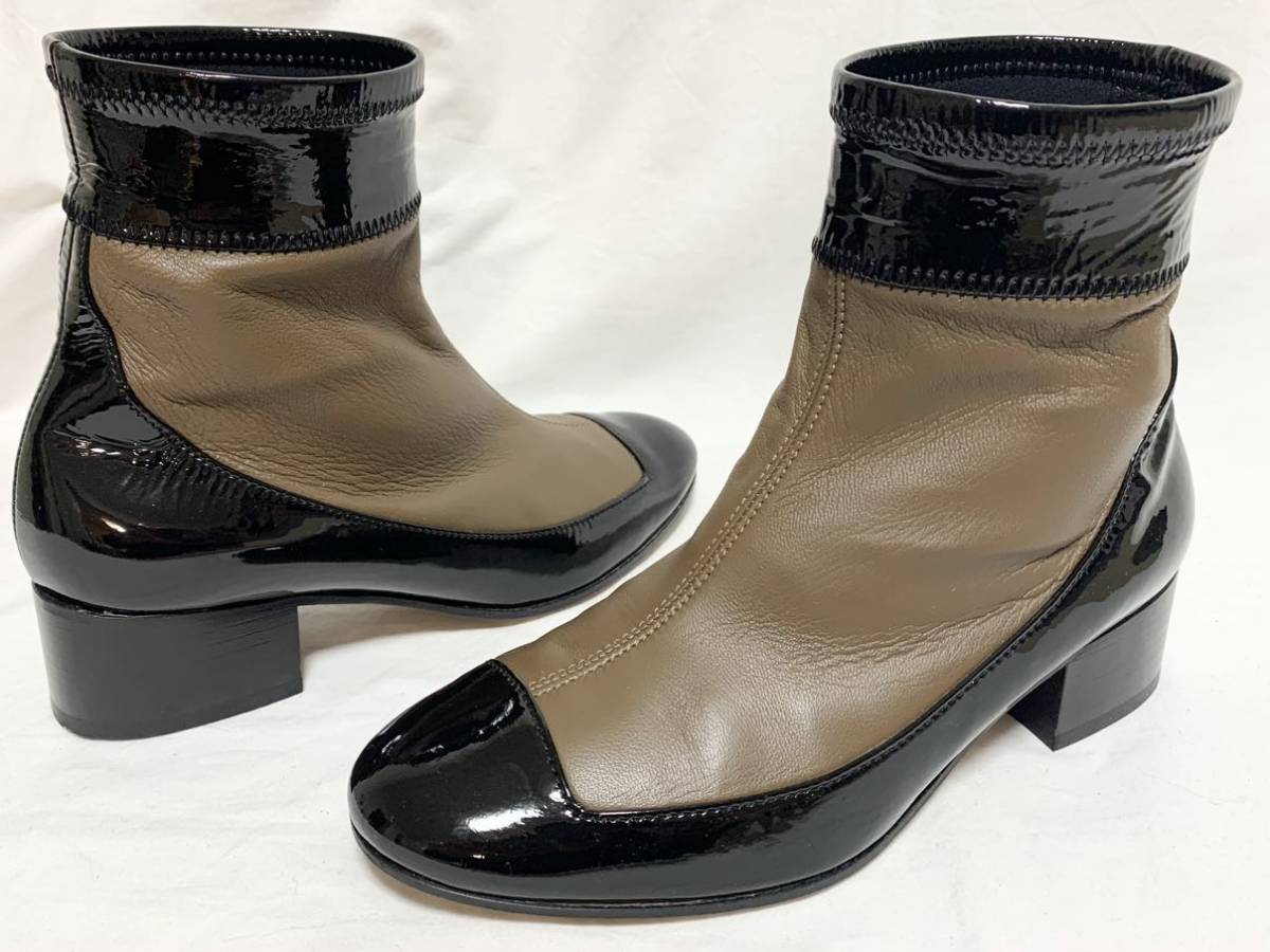 - 希少 超美品 ロエベ LOEWE レザー エナメル パテント ショート ブーツ 靴 レディース シューズ 35 21.5~22cm前後 黒 焦げ茶 バイカラー