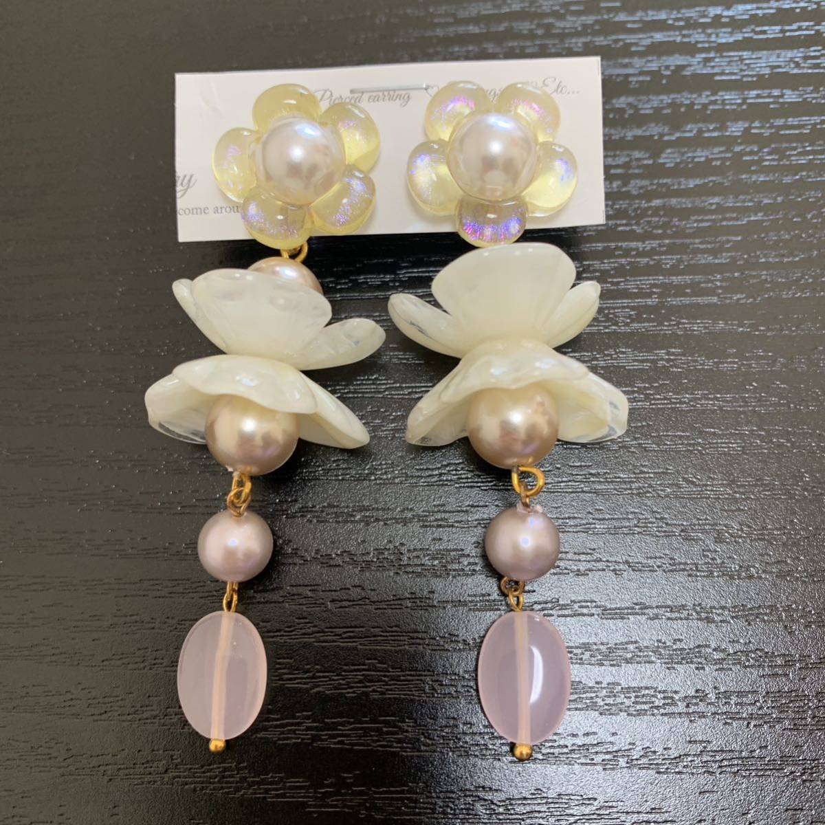 - 夢可愛い メルヘン ホワイト フラワー パープル ピンク フェイクパール ピアス