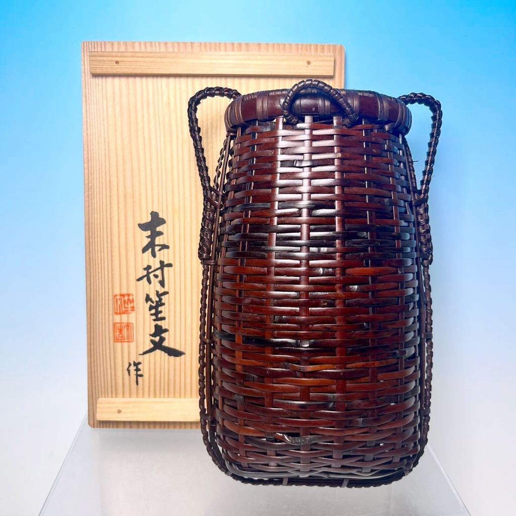 - ☆ 名工 末村笙文 竹編 煤鳳尾竹 鉈花籠 (共箱)花入 竹籠 茶道具