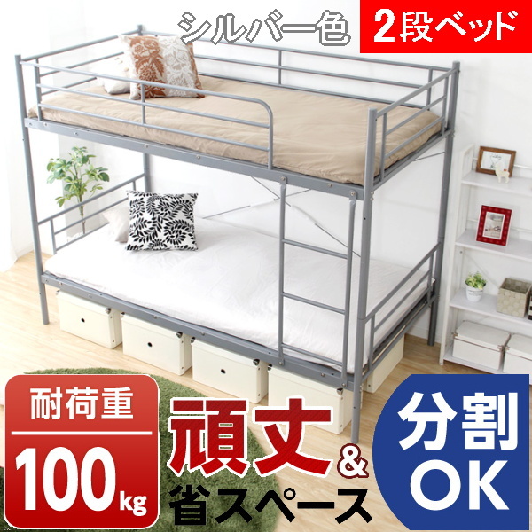 > スチールパイプ 二段ベッド 上段下段が分割できシングルベッド2つにも変更可能 メッシュ床 耐荷重100kg ラーチ シルバー色 組立品③