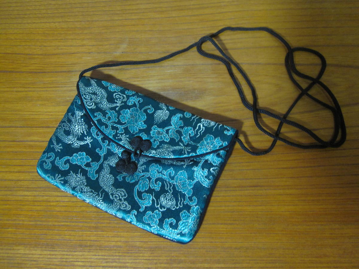 - 中国雑貨 ポシェット 肩斜め掛け紐付き シルク 海外雑貨 光沢グリーン牡丹鳳凰刺繍柄 君宝製。 パーティーバッグ ボーチ