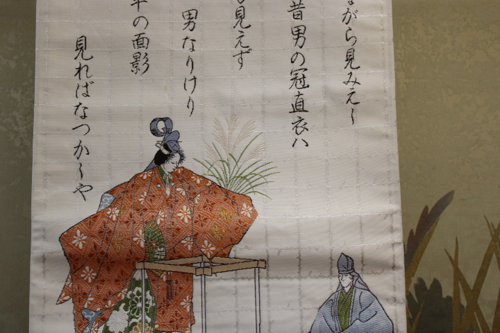 > きもの今昔6456 袋帯 西陣織正絹高級 能狂言絵図 アイボリー地銀箔色紙格子バックに詩入り能衣装柄