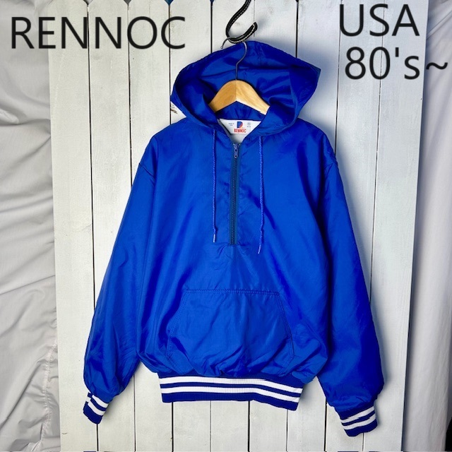 > USA古着 80s~ USA製 RENNOC ナイロンプルオーバーパーカー 36-38 青 オールド ヴィンテージ ハーフジップ アノラック S~M ●156