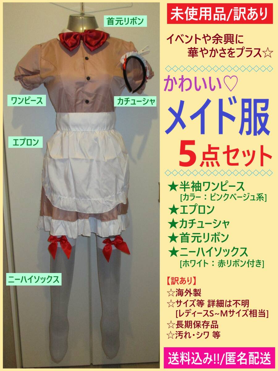 > 訳あり 未使用 かわいい メイド服 5点セット ワンピース エプロン カチューシャ リボン ソックス S~M相当? ピンクベージュ コスプレ 海外製