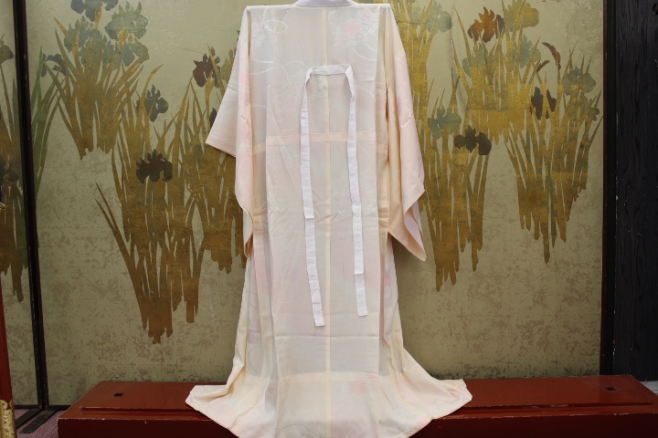 > きもの今昔6577 長襦袢 広衿袖無双身頃単衣仕立て 正絹綸子生地 淡いピンク色ボカシ染 身丈128cm