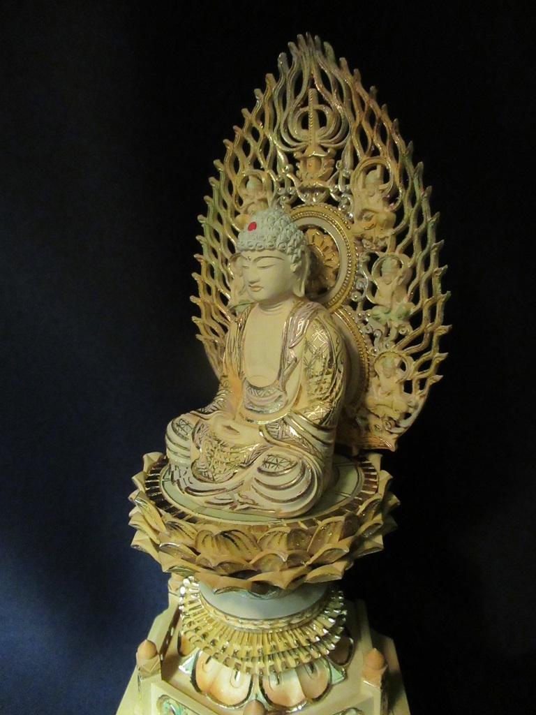 - 「座釈迦/本柘植/プラチナ箔 切金淡彩/飛天光背/2.0寸」総高26cm/木製/「17958」川本仏壇店/川本仏