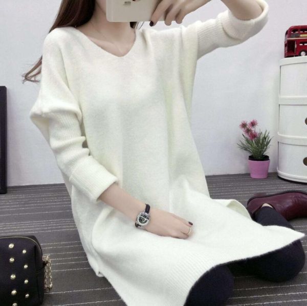 - 新品 * ゆったり おしゃれ ドルマン袖 Vネック ニットセーター スリットワンピース 暖かい F* 白