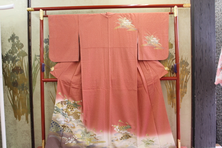 > きもの今昔6787 付け下げ訪問着 広衿袷手縫い仕立て 正絹一越地 総蒔き糊煉瓦色地金糸目ピース加工 身丈160cm