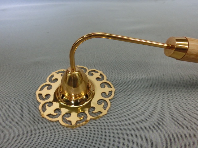 > 【仏具】ローソク消し 白木柄付き 金メッキ仕上げ 全長約34cm 柄のみ長さ約22cm 首先長さ約12cm 寺院仏具 No484