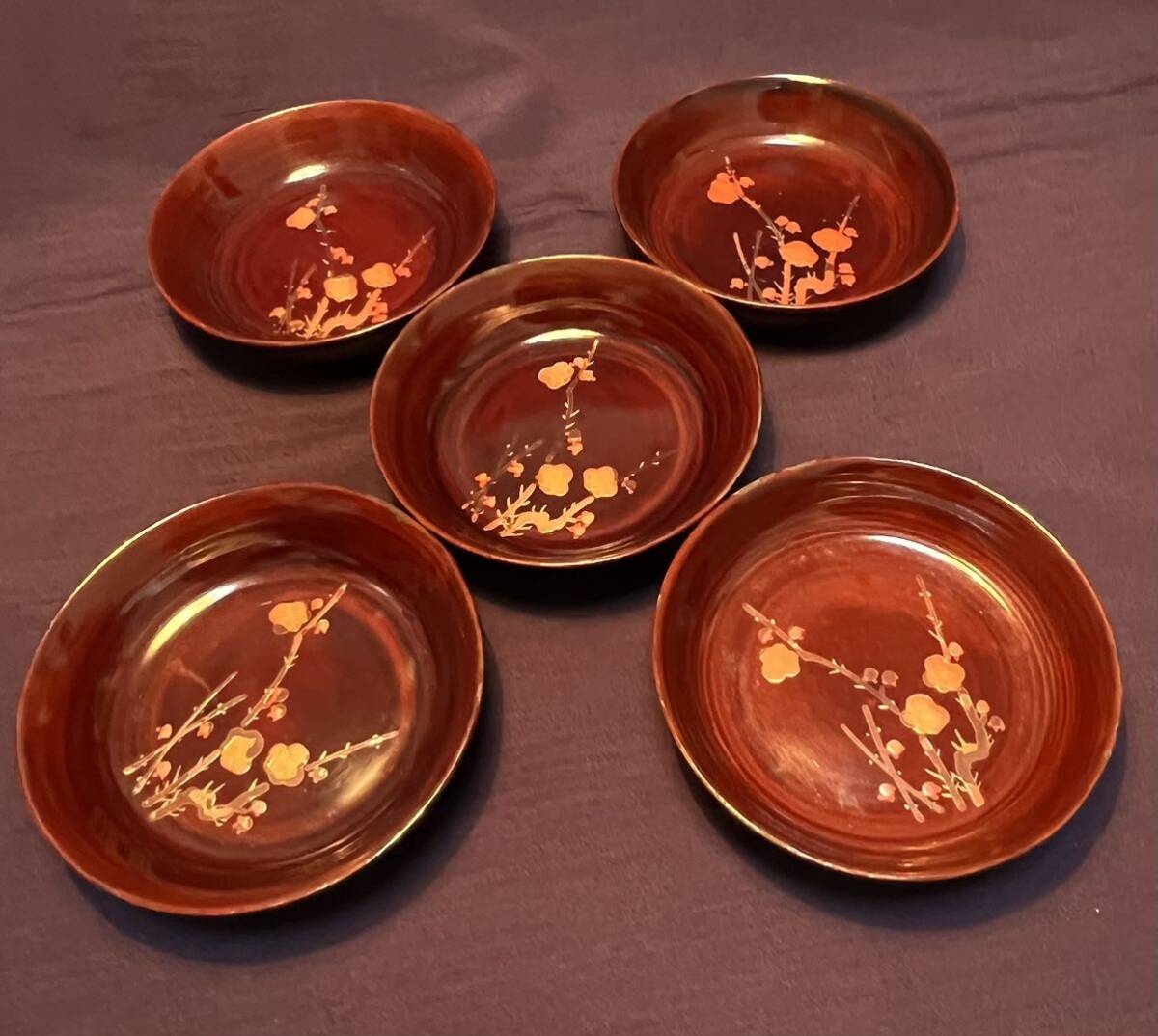- 漆塗り梅花文小皿五客縁ハゲ有り[7437]
