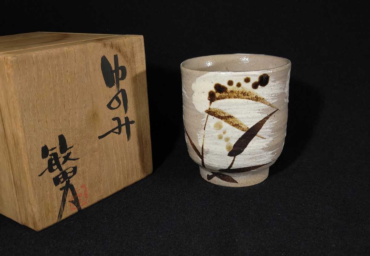 - 武田敏男 「ゆのみ」 白釉 鉄釉 草文 湯呑 共箱 煎茶道具 茶道具 益子焼 師:田村耕一/北出塔次郎/米沢蘇峰 bci-09g1863
