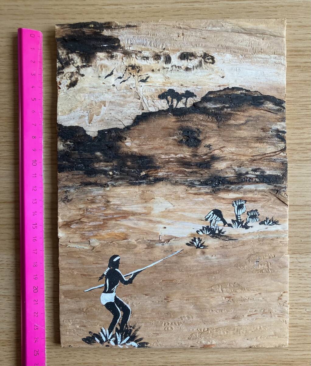 > オーストラリア先住民 アボリジナルアート 樹皮画 バークペインティング 「エミューを狩る人」 約18cm×約25.5cm 作者、制作年不明