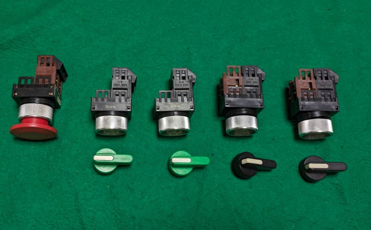 - 【中古・送料無料】スイッチ5個セット! 富士電機製 レバー(オルタネイト)プッシュ(モーメンタリー)Φ22 AH22-PW2、-M 動作確認済