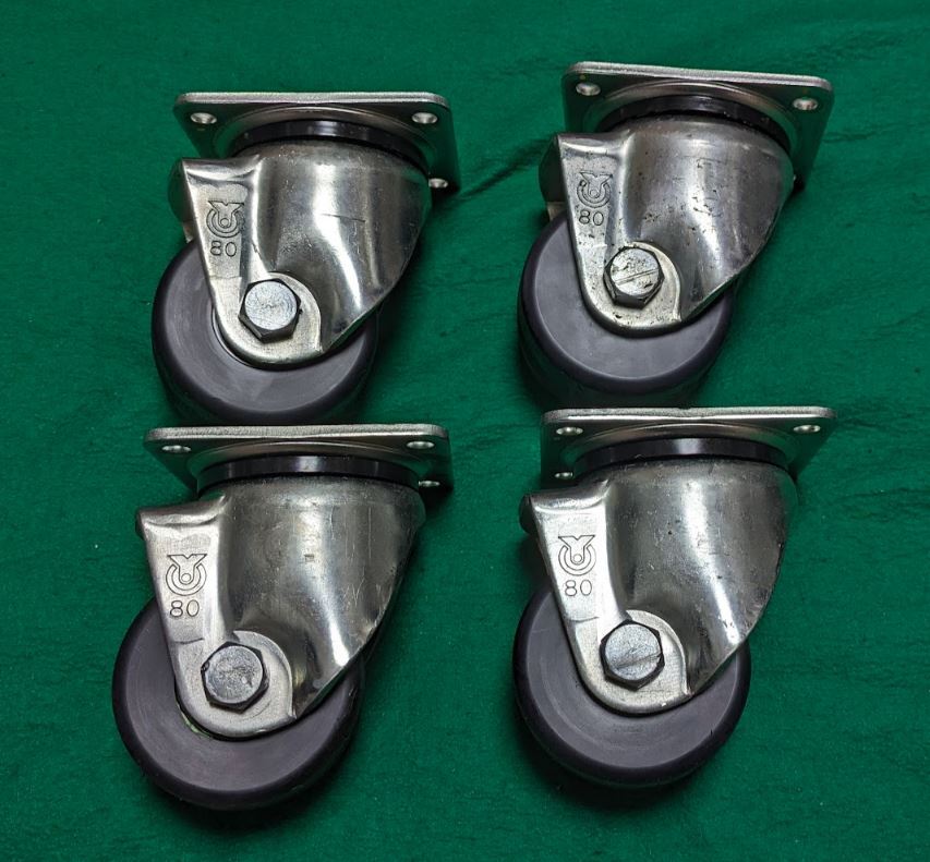 - 【中古・送料無料】4台セット! 車輪直径 80mm幅48mm 低床重量キャスター(自在)耐荷重300kg/台↑ ベアリング(ころ式)ベース孔4-M8用