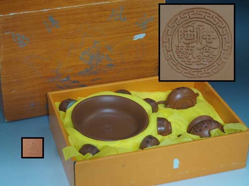 - C0378 陶印有り 中国 朱泥 茶器揃 化粧箱付 ☆ 煎茶器 茶器 茶壺 茶壷 柴砂壷 茶海 茶杯 茶盃 煎茶碗 湯呑 茶船 唐物 陶器 美品 良品 無傷