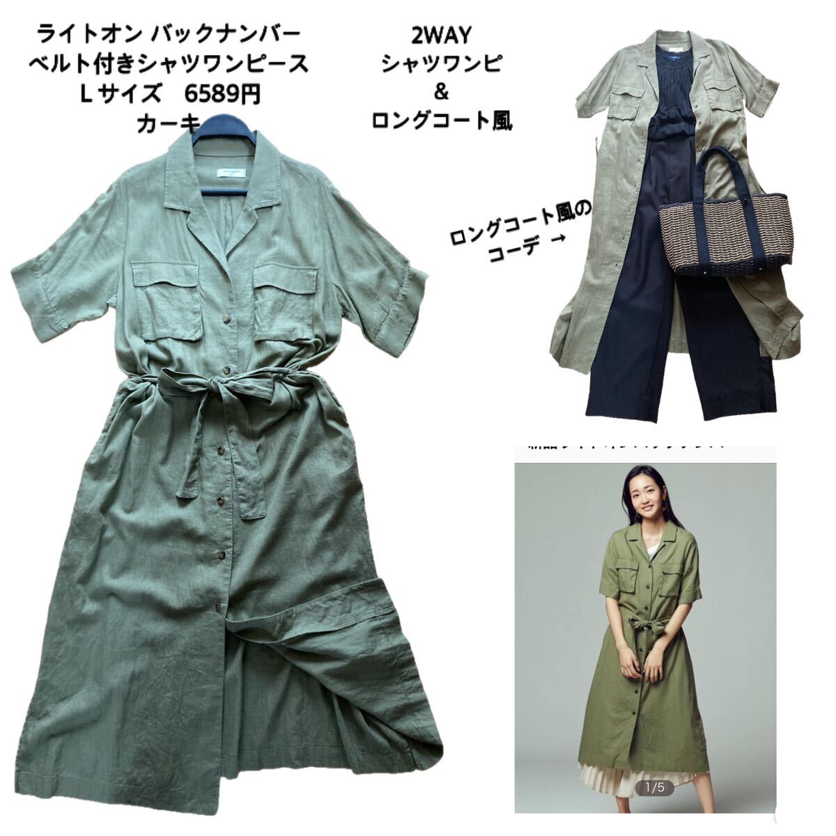 - ●ライトオン●バックナンバー ベルト付きシャツワンピース カーキ Lサイズ 2WAY ワンピース&ロングコート風