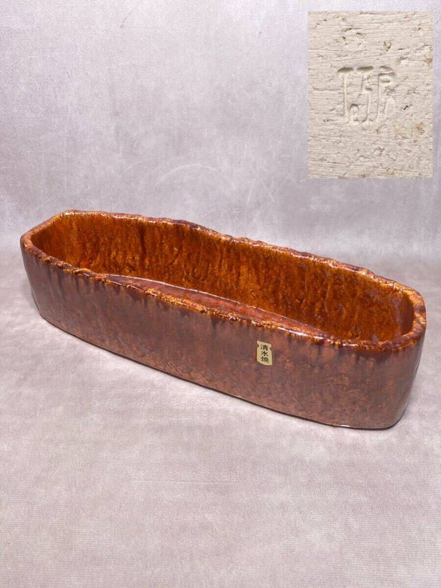 - 新品 昭和 ビンテージ 清水焼 大きな花器 34cm ★ 花瓶 プランター 剣山 骨董 アンティーク 楕円 陶器 茶道具 盆栽 未使用 京都