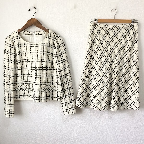 - #wnc レリアン Leilian セットアップ 13 アイボリー 黒 大きいサイズ チェック柄 ツイード バックジップ フレア レディース [851756]