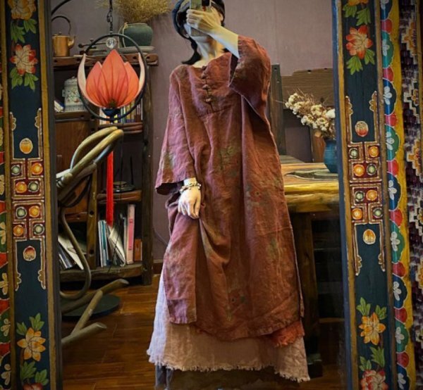 - lgn 1944 ロングワンピース 襤褸 アンティーク風 洋服ミックス ロマンファッション ポップ 麻100% 花柄