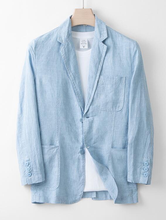 - 新品★100%麻★リネンテーラードジャケット ビジネスジャケット ブレザー メンズ 2ボタン シングル カジュアル ブルー