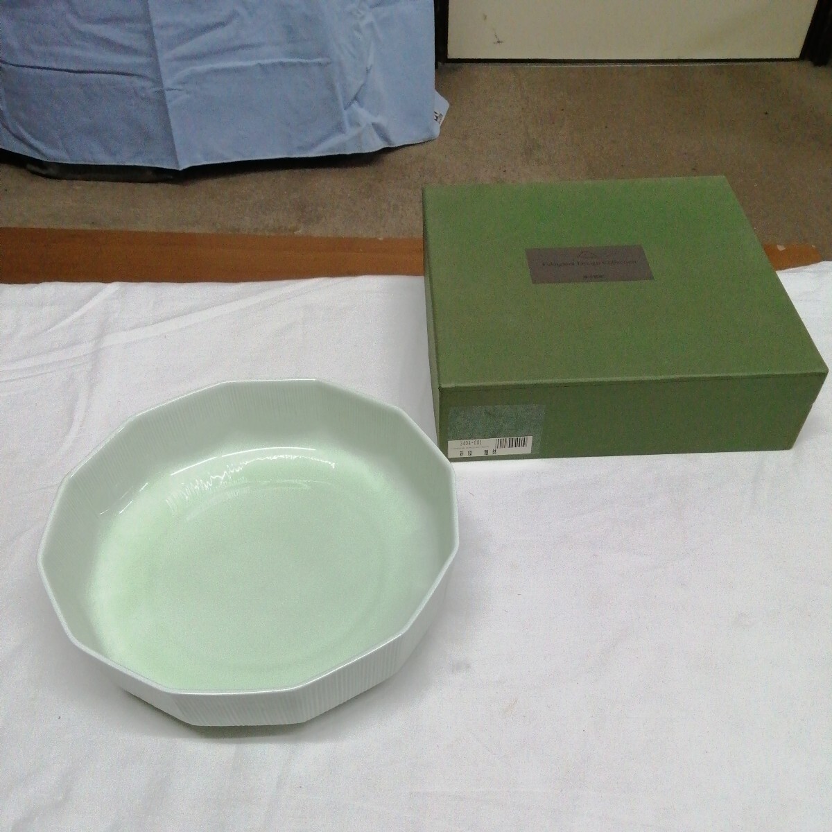 > 箱入未使用品 有田焼 宮内庁御用達 深川製磁 青磁 緑 麺鉢 大鉢 新緑 12角形 深鉢 盛鉢 鉢 面取 和食器 美