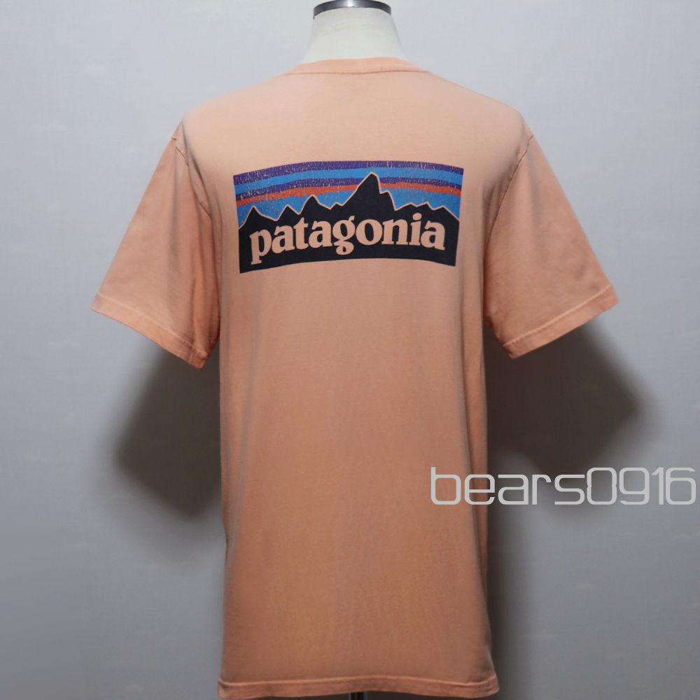 - アメリカ購入 USED品 Patagonia パタゴニア フィッツロイ ホライゾンズ レスポンシビリティー 2面プリント ポケットTシャツ サーモンPINK L