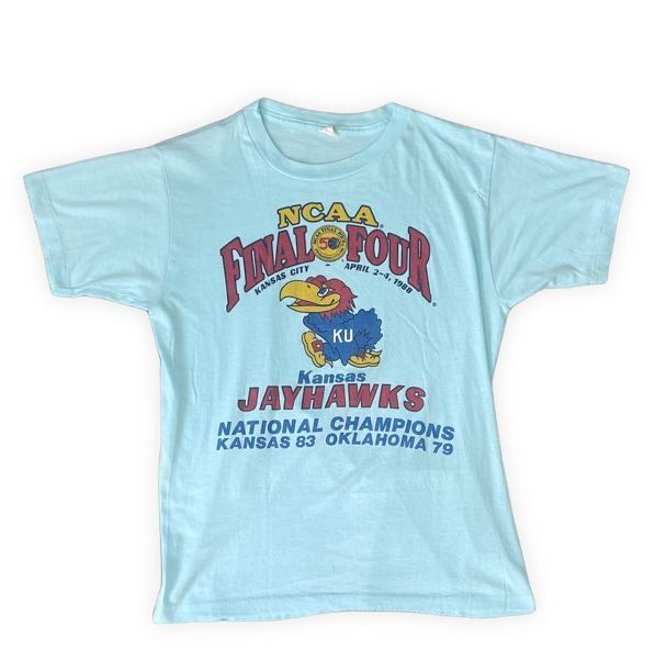 - 80’s 米国製 アローレ Alore ビンテージ カレッジ Tシャツ NCAA カンザス ジェイホークス ブルー 青 L [l-0947]