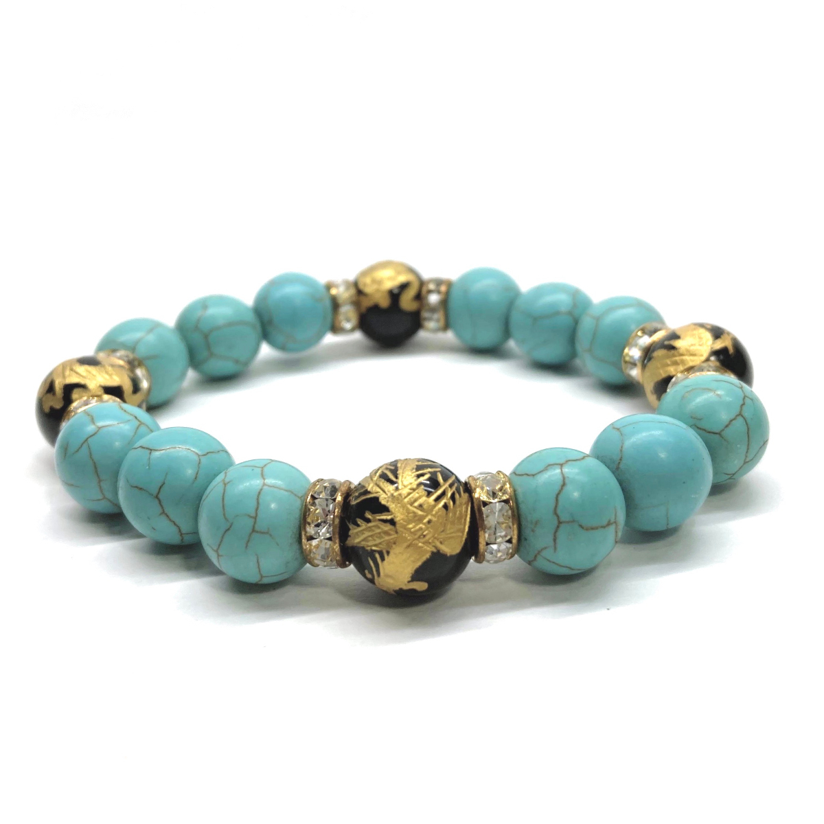 - 四神獣金彫オニキス×ターコイズ 12mm パワーストーン ブレスレット青龍 白虎 玄武 朱雀 運気上昇 お守り 金運 健康運 四神獸 四神相応 G2