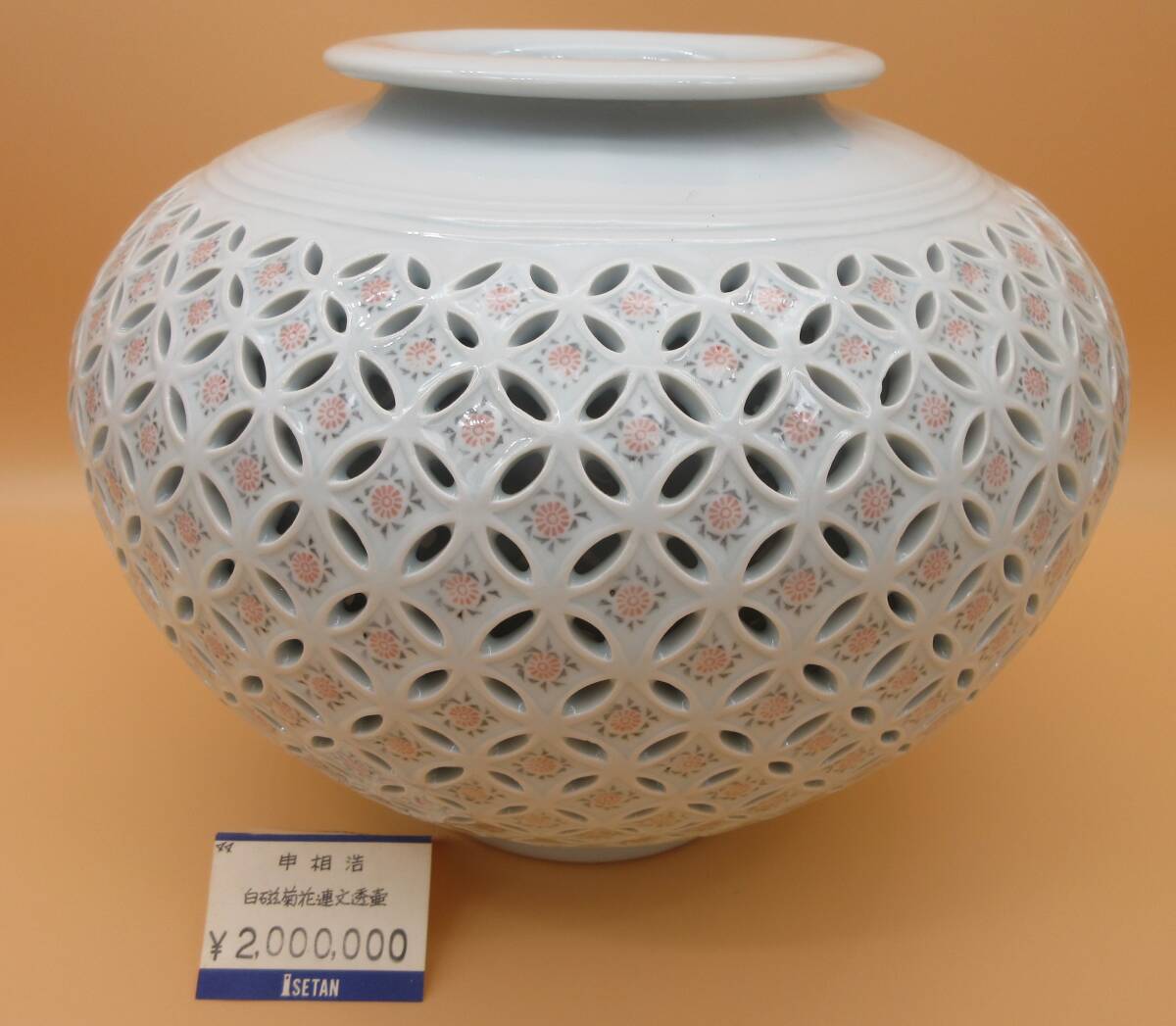 > 申相浩 白磁菊花連文透壺 ISETAN個展200万 韓国人間国宝 釜谷陶房 共箱 辰砂 朝鮮 傑作 未使用