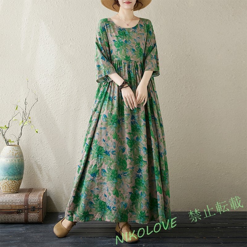 - 新品カジュアル ゆったり大サイズ プリント柄 丸首 七分袖 ロングワンピース グリーン LE637