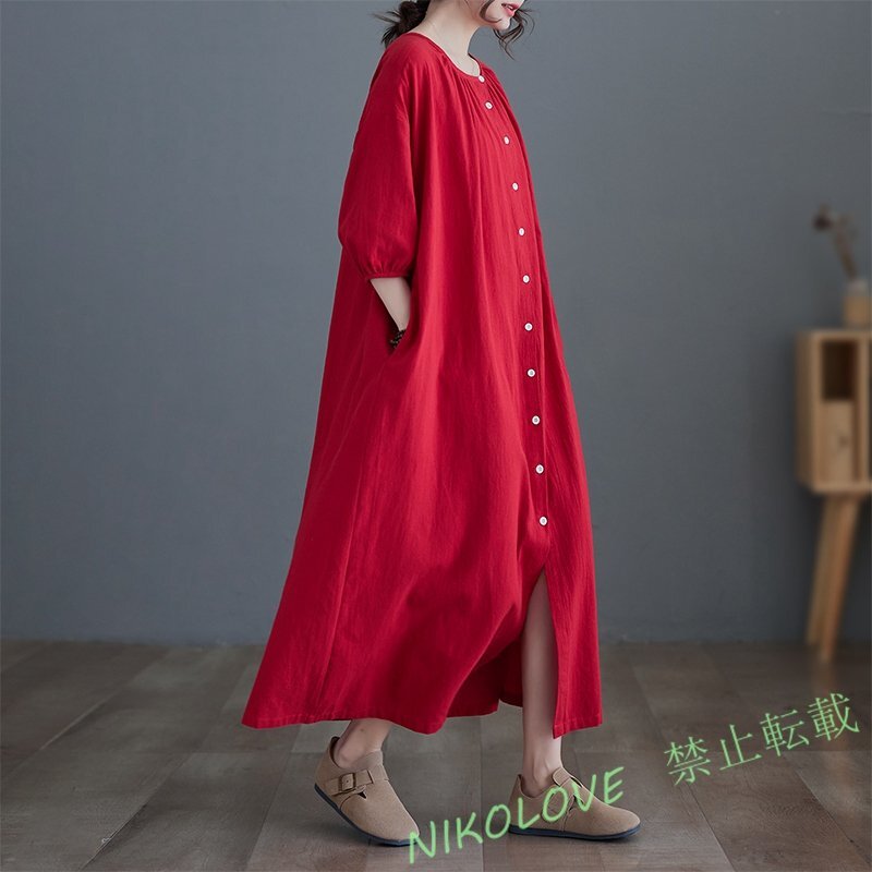 - 新品レディース 綿麻 カジュアル ゆったり大きいサイズ体型カバー ロング丈 長袖ワンピース レッド LE588