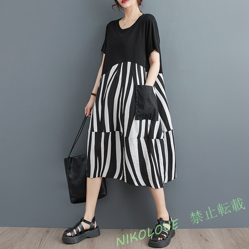 - 新品レディース ゆったり大きいサイズ カジュアル体型カバー ボーダー柄 切り替え 半袖 ロングワンピース LE786