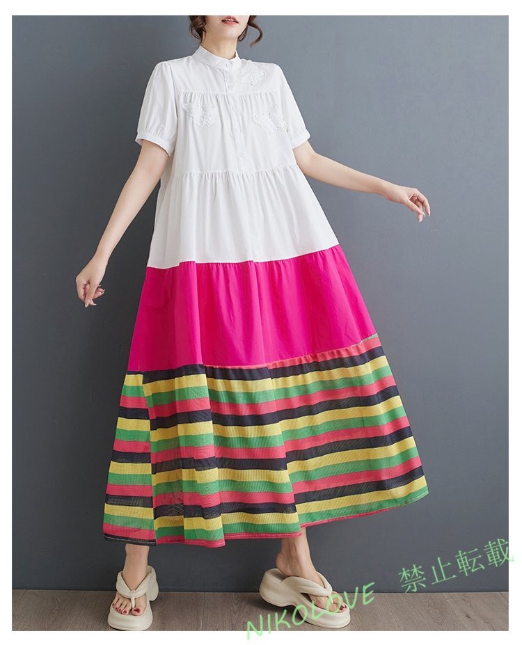 - 新品ゆったり大きいサイズ カジュアル 縞 切り替え 配色 半袖 シャツワンピース 白 LH419