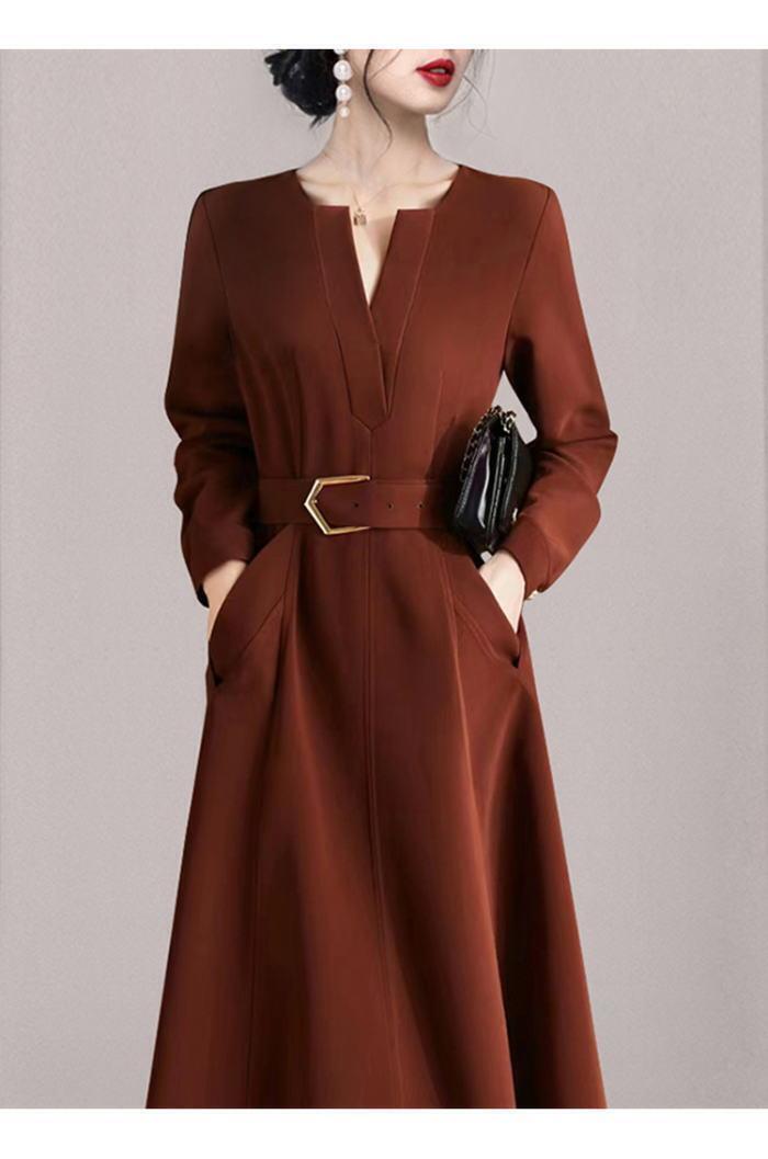 - 【ブラウン色★L】ひざ丈ワンピースレディースベルト付き